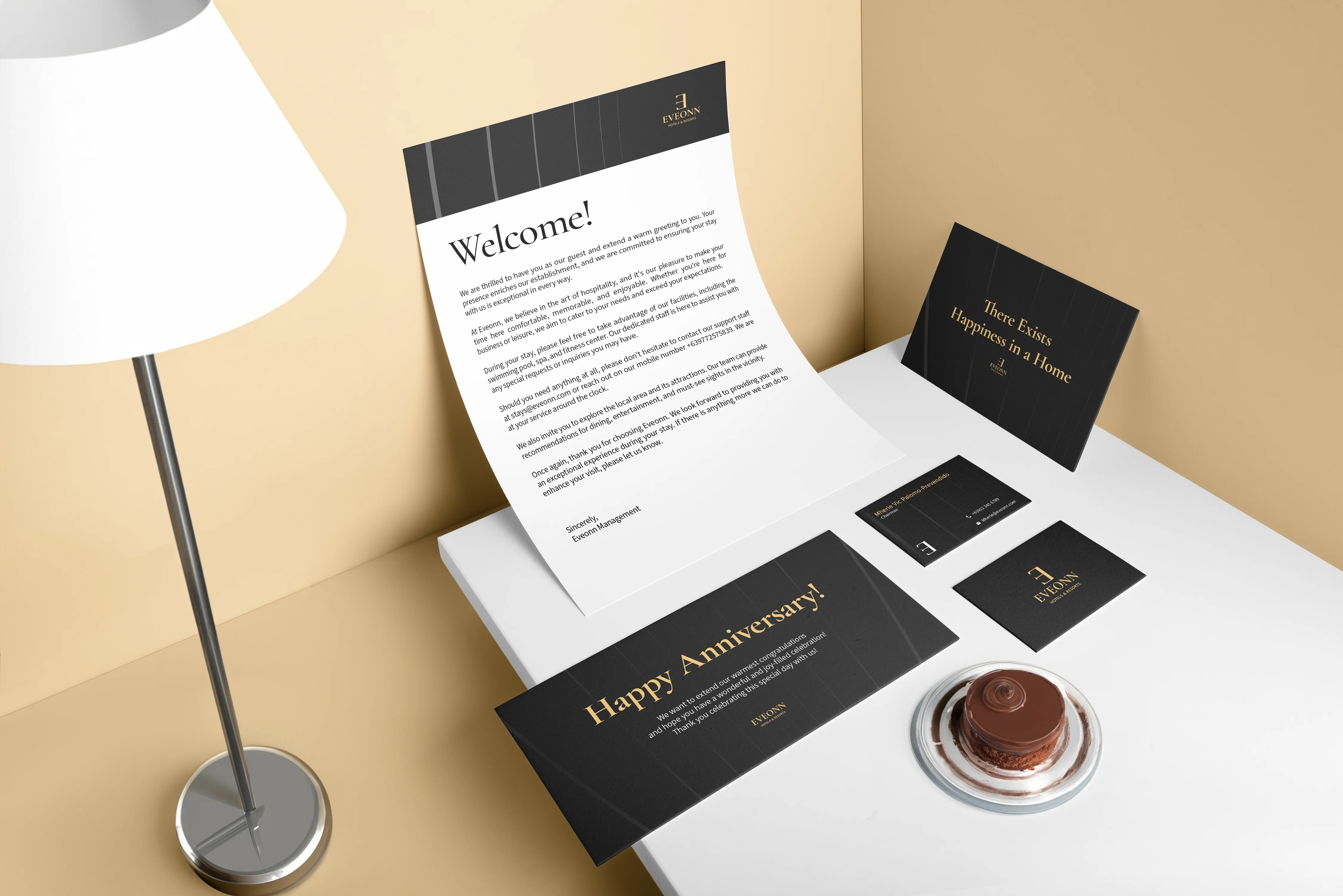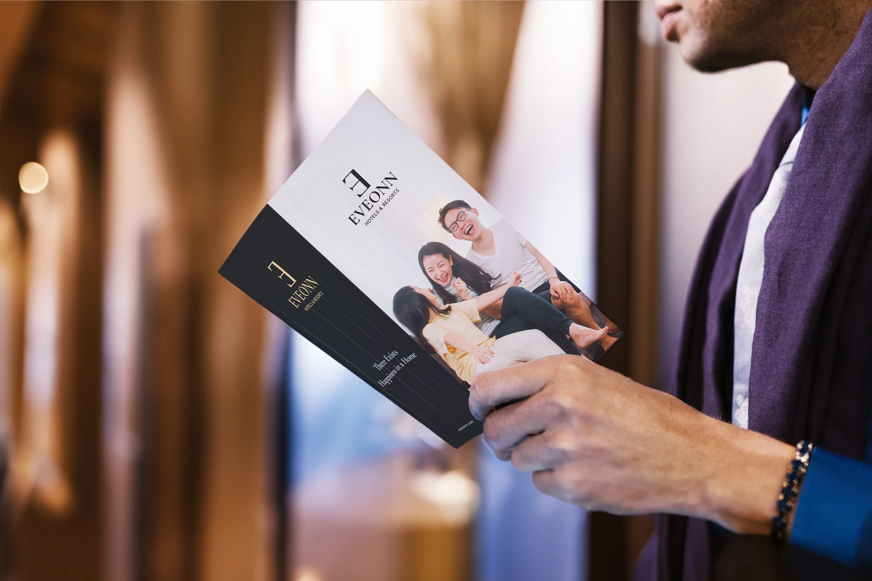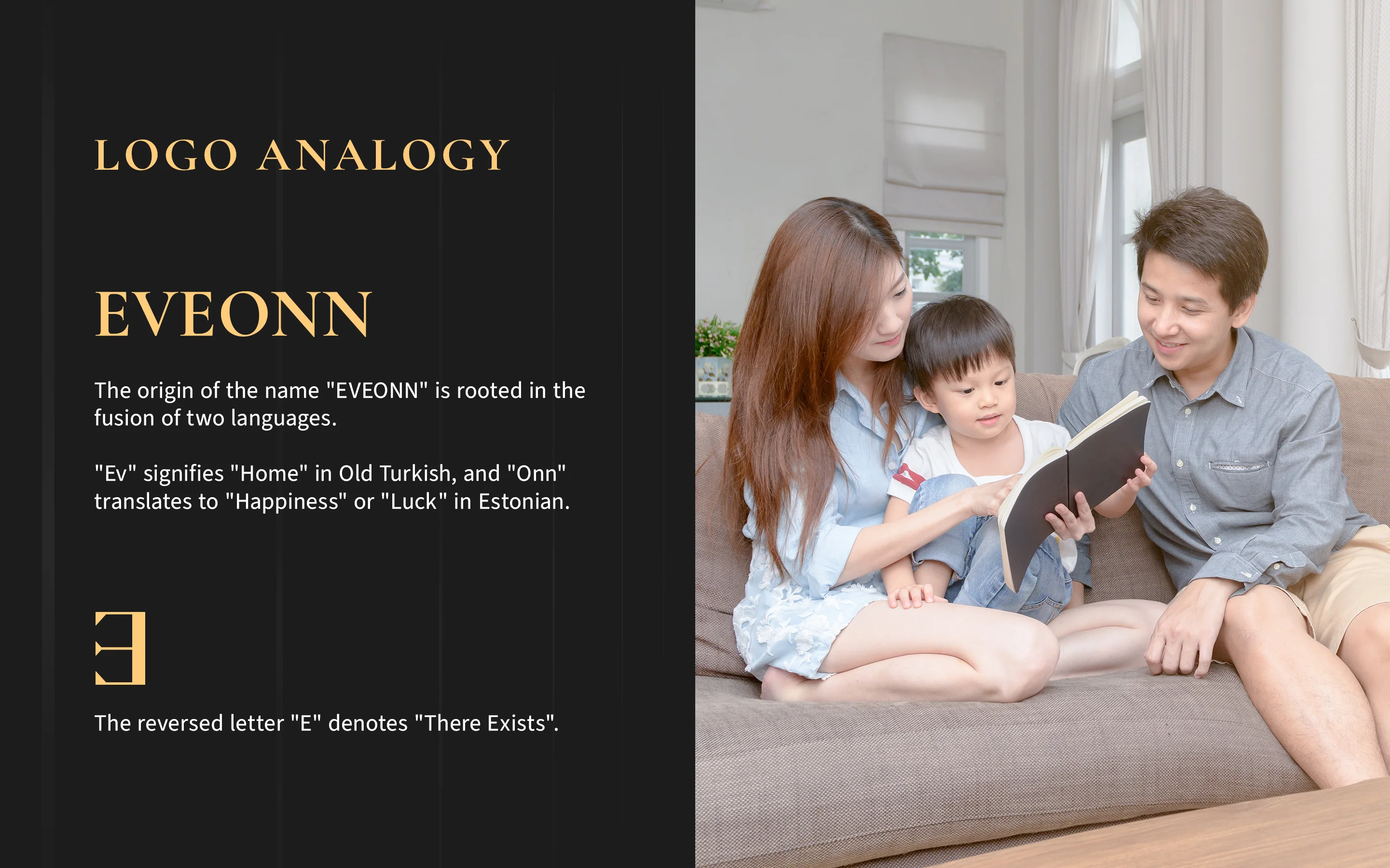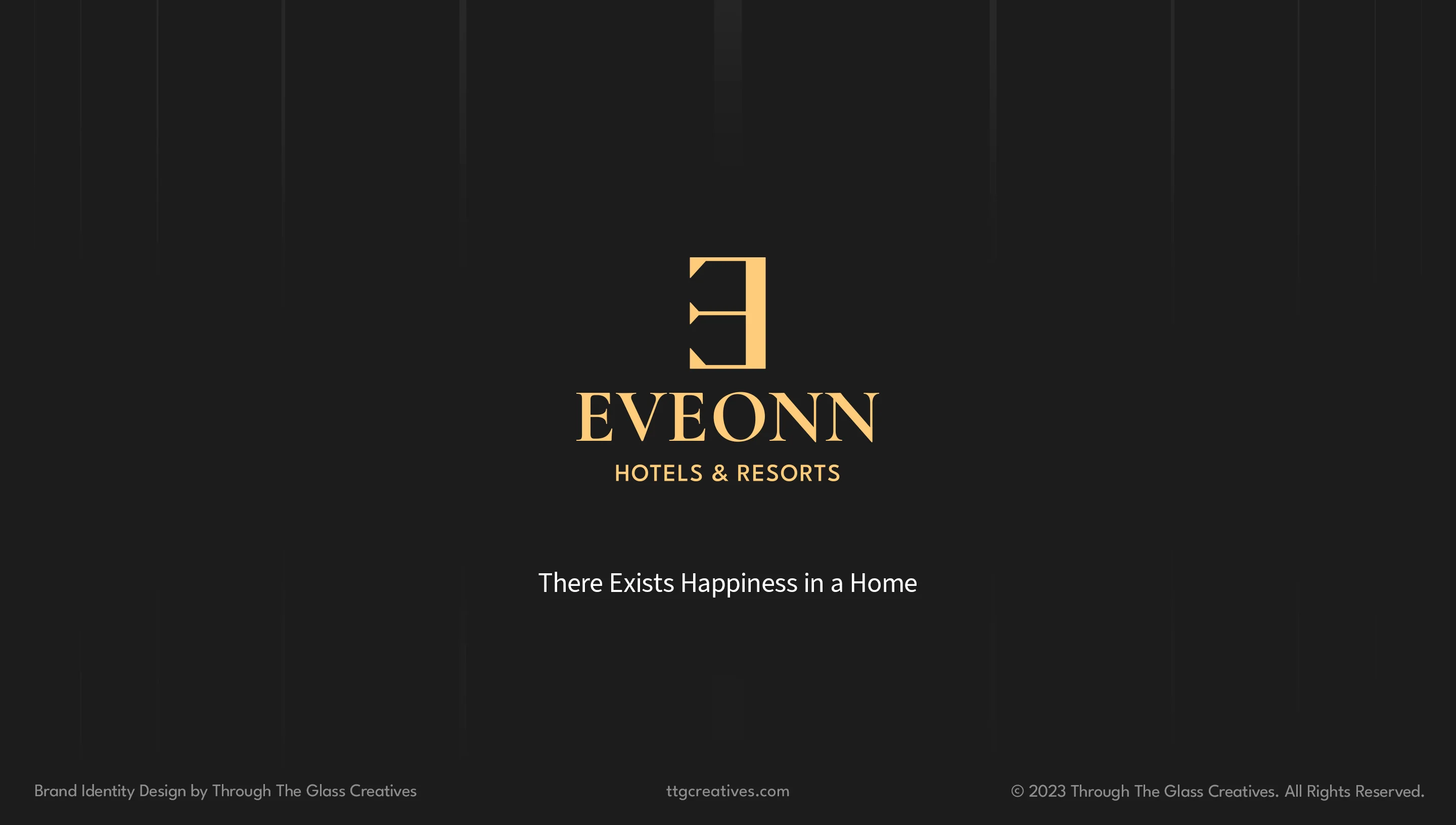 "Ev" means "Home" in Old Turkish. "Onn" means "Happiness" in Estonian. The reversed "E" denotes "There Exists." Together, the name symbolizes "There Exists Happiness in a Home." TTGC built the brand from the ground up for this growing Philippine hotel chain with 10–15 locations, ensuring consistency across every touchpoint — from lobby signage to room amenities.