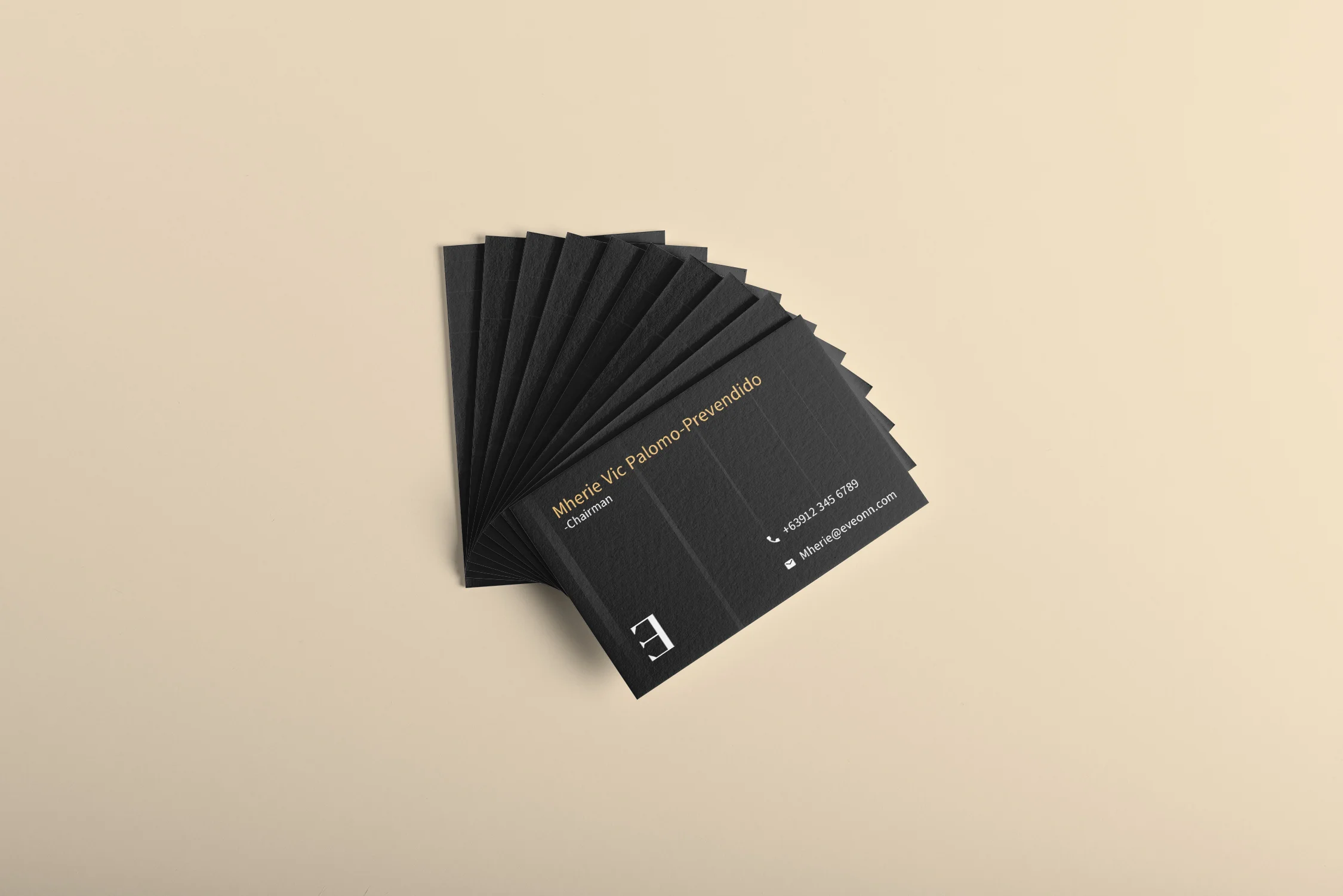 Black business cards — Mherie Vic Palomo-Prevendido, Chairman.