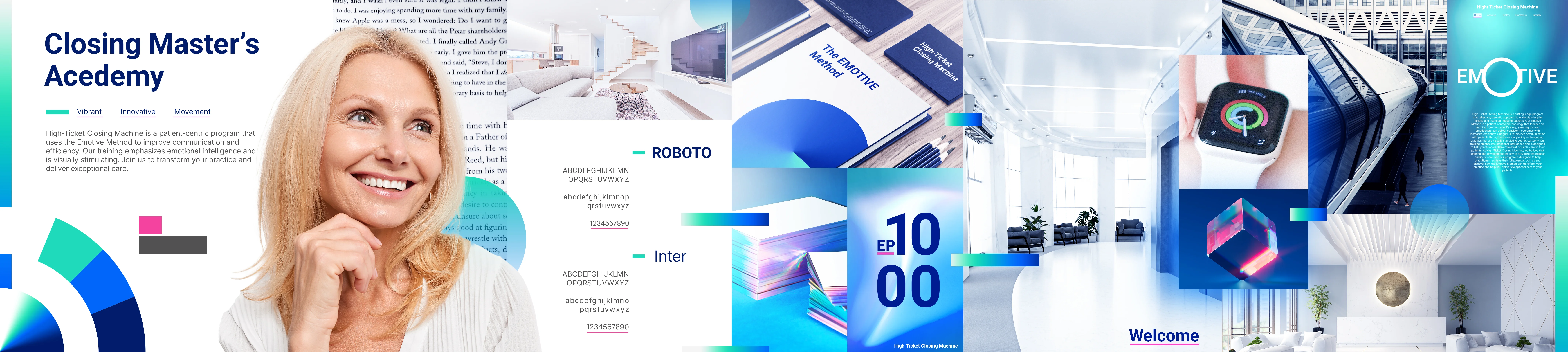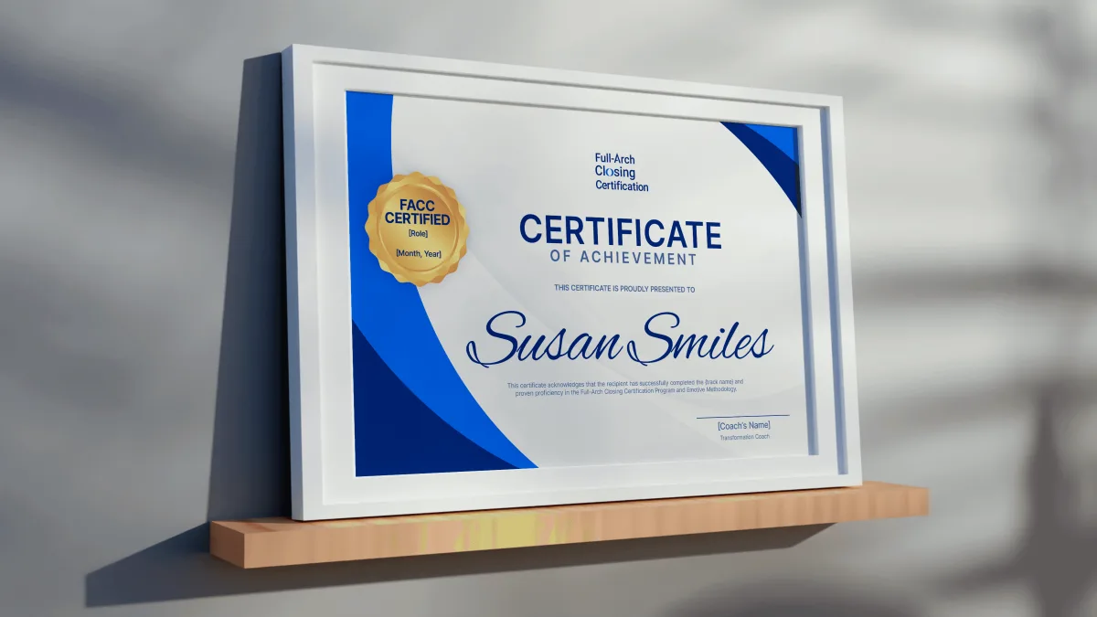 The Full-Arch Closing Certification is a high-ticket training program for dental professionals, teaching them to present dental implant solutions using the EMOTIVE Method. TTGC built the entire brand identity from the ground up — from the two-word essence "Vibrantly Innovative" through stylescapes, logo design, animation, course materials, worksheets, and presentation slides. The product evolved through three names — High-Ticket Closing Machine, Closing Master's Academy, and finally FACC — with the visual identity maturing at each stage.